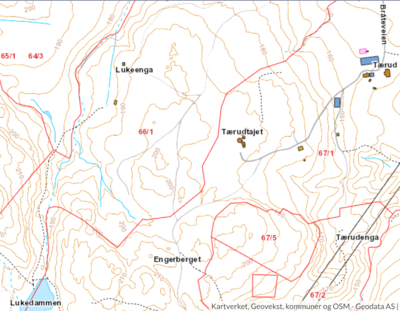 Kartutsnittet viser Tærudtajet i sammenheng med Tærud gård, Lukedammen og plassen Lukeenga. Rett til høyre for utsnittet ligger Melbygårdene og motorveien E6.