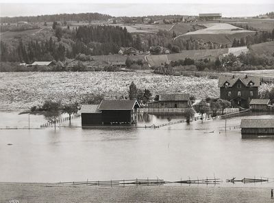 Fetsund jernbanebru under flommen 1910. Atthaldslensene ved Bingen lenser klarte ikke å stanse de svære tømmermengdene.