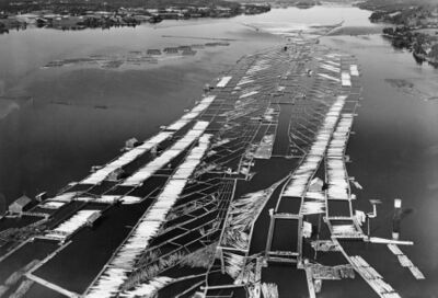 Fløtning gjennom Vrangfoss sluser i Telemarkskanalen