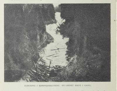 Fløtning i Bjørnsjøhelvede i Nordmarka: En løsnet haug i gang.