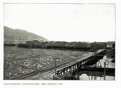 Tømmerlager på Strandheim bruk, tilhørende M. Thams & Co. Store mengder tømmer i vannet, ferdig trelast på land. 1893.