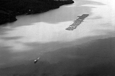 Tømmerslep i Øyeren 1984. Slepene over Øyeren var de største buntslepene i Norge med normalt opp til 200 000 stokker – unntaksvis opp til 325 0000 stokker. Slepet på bildet er bare halvparten av normal størrelse. Fra 1960-tallet ble stadig mer av tømmeret fraktet landverts.