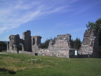 | Man ser endnu levninger av klostrets forrige skjønne grundmurede kirke. Den er opført av store brudstene, dels ogsaa av huggen grøtsten, som man har brukt i hjørnene, om vinduer og døre samt ovenpaa kirkens grundfot, Kirken har været 21 alen bred, 60 alen lang og har hat en dør paa den søndre, en ogsaa paa den nordre side, dog ikke like mot hinanden, men den største paa den vestre gavl 3 alen bred. Paa den nordre side har dessuten været 2de døre til 2de derhos staaende kapeller, hvilke døre ei have, som hin, været hvelvede, men overlagt med store flate stene. | ||