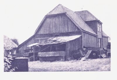 Arklåven på Thor Olsens løkke, oppført 1825. I den laveste delen til høyre av låven var det en kjeglebane. Saxegården i bakgrunnen. Arklåven revet i 1962.
