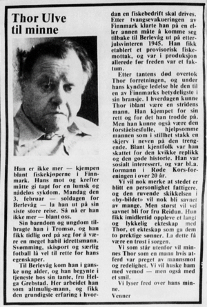 - Thor Ulve til minne. Nekrolog fra venner. Finnmarken, lørdag 8. februar 1986, s. 2. Digital versjon på Nettbiblioteket.