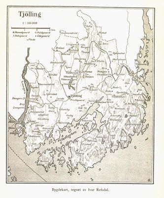 Kart over Tjølling fra 1915, tegna av Ivar Refsdal.