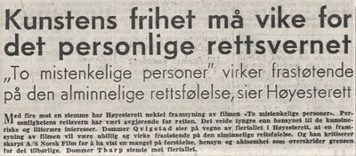 Filmen skulle ha premiere andre påskedag 1950, men Oslo byrett avsa kjennelse der det ble lagt ned forbud mot visning. Retten kom til at filmen ikke var ærekrenkende, men at den brøt med det personlige rettsvern. I og med at navnet var endra, mente filmbransjen at retten gikk for langt. Boka hadde vært på markedet siden 1933, uten reaksjoner, og de følte at filmmediet ble behandla annerledes enn andre kunstneriske uttrykksmåter. Saken gikk videre i systemet, og det endte med at Høyesterett stadfesta dommen i desember 1952.