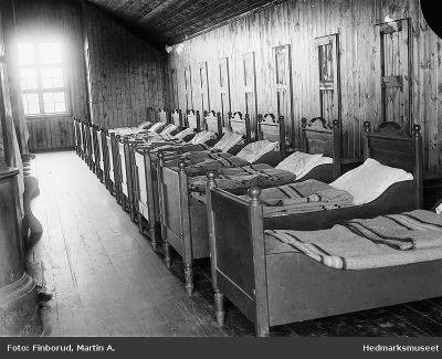 Sovesal på Toftes Gave på Helgøya, fotografert mellom 1909 og 1923.