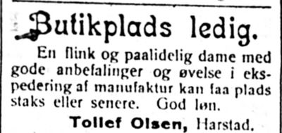 Tollef Olsen-eiendommen (Matr.nr. 68 - Bruk 1 - Br. nr. 1 Toften, Bergseng). I 1847 ble bruket delt i to like parter, og i 1912 ble det igjen delt i to like parter. Tollef Olsen, (1864-1951), arvet den ene halvpart og beholdt br.nr.1, mens broren Ernst Olsen, f. 1868, arvet den andre halvparten (br.nr.10 -Toftegård). Tollef var g.m. Gerhardine Emilie Erlandsdtr., (1871 Refsnes, Kvæfjord -1943 Tofta). Hun var søster til Marie Erlandsdtr, som var g. m Eilert Ingebrigtsen på Høgforsen. I tillegg til bruket drev han en betydelig forretningsvirksomhet i Harstad sentrum. Forretningen hans hadde først lokaler i «Søren Hartvigsen-gården» (senere kjent som «Bothner-gården») på Rikard Kaarbøs plass 1. I 1913 bygde han egen forretningsgård i Strandgata 18 A (senere kjent som Selmer Hansen-gården). Forretningen gikk imidlertid konkurs, og en tid etter det hadde han en liten forretning i kjelleren i bolighuset på Tofta (Toftabakken 22).