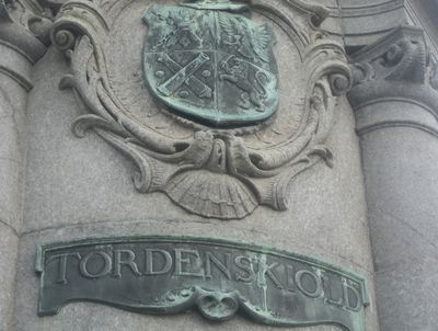 På sokkelen er Tordenskiolds våpenskjold gjengitt med sine fire felt: Første felt med en tordenkile, andre felt med en ørn (symbol for erobringen av det svenske skipet «Vita Örn»), tredje felt med to krysslagte kanoner og tre kuler (symbol for det dansk-norske «løsen» dvs. saluttsignalet) og fjerde felt med en oppreist løve som holder et sverd (løvefiguren brukte han før adlingen).