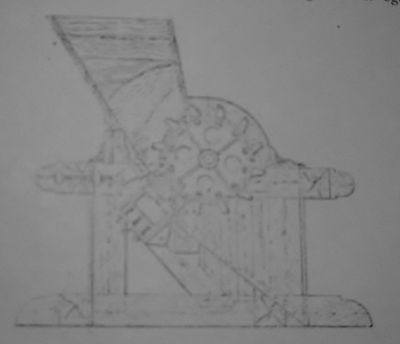 Konstruktionen er, som det vil sees af tegningen, omtrent som den hos os almindelige benævnte «Norrahammar-type» og nogenlunde den samme som ovennævnte nr. 8 fra samme firma, men den er større, da den er bestemt for fabrikbrug. Den er en forbedring af den i fjor prøvede maskine nr. 2. Den eneste afvigelse fra konstruktionen af maskine nr. 9 er, at trommelens pigger er forholdsvis flere i antal. Slagbroen er ogsaa for denne maskine stillbar, hvilket kan være af betydning for regulering af muldgehalten.