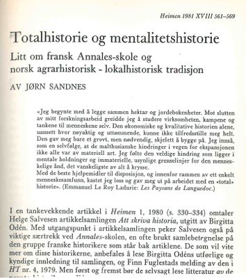 - Sandnes, Jørn: «Totalhistorie og mentalitetshistorie. Litt om fransk Annales-skole og norsk agrarhistorisk–lokalhistorisk tradisjon», i Heimen , bind XVIII, 1979-81.