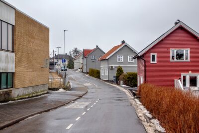 Parti fra Triangelveien, sett i vestlig retning. Vi skimter litt av anlegget til Lande skole til venstre.