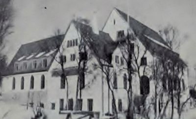 Under okkupasjonsårene hadde den tyske Wehrmacht rekvirert skolebygningen fra 1941 til 1945. I 1945 skulle man sikre seg mot at det ikke fantes veggdyr etter okkupantene. Oslo Veggdyrkontroll skulle røyke ut utøyet med brennende svovel, men under dette arbeidet brant bygningen ned 3. oktober 1945. (En måte å bekjempe veggdyr på, var å fremstille gassen svoveldioksyd ved hjelp av åpen ild.) Firmaet fikk bot, men hadde sørget for at det var økonomisk ansvarsfri. Gjenreisningsarbeidet foregikk fra 1945 til 1948 etter Bærums-arkitekten Bård Hjeldes tegninger. Han må ikke forveksles med den opprinnelige arkitekten med nesten samme navn. Hjelde ble valgt fordi han hadde tegnet Romerike Folkehøgskole som åpnet i 1940.