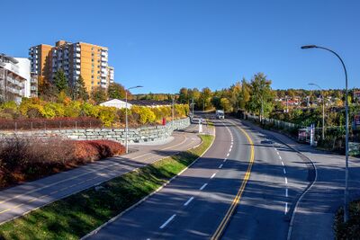 Tvetenveien sett vestover fra gangbrua ved Hellerud T-banestasjon.