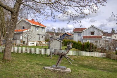 Svenskehus i Ulsrud hageby sett fra et parkområde ved Østmarkveien.