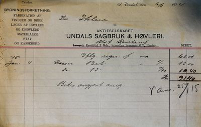 Nota som viser hva Undals sagbruk & Høvleri produserte rundt 1914: "Bygningsforretning. Fabrikation af vinduer og døre. Lager af høvlede og uhøvlede materialer, stav og kassebord."