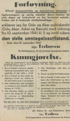 Under andre verdenskrig innførte Josef Terboven unntakstilstand i Oslo-området den 10. september 1941 i forbindelse med melkestreiken, og i Midt-Norge den 6. oktober 1942, se unntakstilstanden i Midt-Norge 1942. I begge tilfeller førte unntakstilstanden til utvida bruk av dødsstraff.