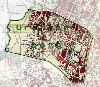 Det finnes to små parkanlegg i strøket, Riddervolds plass og Uranienborgparken som er restene etter furuskogen og utfartstedet Uranienborgskogen. Tidligere var det flere skoler i området, men de eneste som gjenstår er Uranienborg skole (grunnskole) og Hartvig Nissens skole (videregående). Soknekirken Uranienborg kirke ligger i Uranienborgveien. I tillegg finner man St. Dominikus kloster med kirke i Neuberggata.