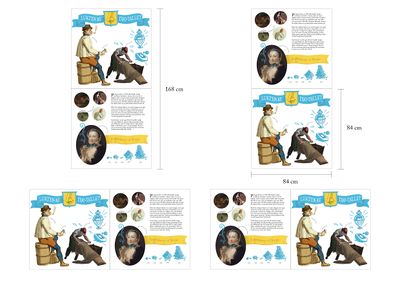 Plakatene er 84x84 cm, og bør trykkes på A0-format, som så beskjæres. De er gjort kvadratiske for å fleksibelt kunne settes opp i ulike lokaler (se bildet). For mer om trykk og print, se forslagslisten som er vedlagt sammen med utstillingen i egen nedlastningsmappe på nettstedet Tidvis.[1]