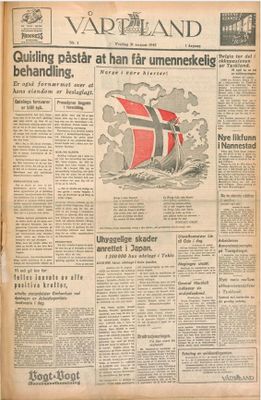 Førstesida på den aller første utgaven av Vårt Land, 31. august 1945.