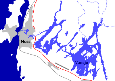 Vansjø strekker seg østover fra Moss. Den røde streken er E6, den tykke og rette grå streken er Moss Lufthavn Rygge.