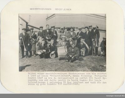 Musikkforeningen Nordstjernen. Bildet er tatt i parken foran musikkpaviljongen. Til venstre ses en del ar arbeiderforeningen som brant under andre verdenskrig
