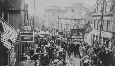 Det var tøffe forhold i Tromsø i 1930-årene og gode grunner for å demonstrere på 1. mai. Her marsjerer toget opp Fredrik Langes gate og passerer Axel Jensens gullsmedforretning i Vestregata 27.