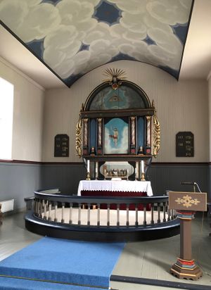 I den nye kirken i 1905 ble altertavlen fra den gamle kirken satt inn, men intet årstall forteller hvor gammel denne er. Nederste felt i altertavlen fremstiller innstiftelsen av nattverden. Opprinnelig besto øverste del av et maleri av Erik Valne, som i sin tid malte altertavler til flere kirker i Trøndelag. Maleriet fremstilte Jesus på korset med tre kvinner under. Bak dette maleriet fant sogneprest Ofstad i 1930-årene et himmelfartsbilde. Dette bildet utgjør i dag øverste del av altertavlen, mens Valnes korsfestelsesbilde henger ved siden av prekestolen.