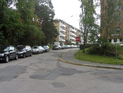 Til veien ligger blokker som tilhører OBOS-borettslaget Solhøgda, innflyttet 1959-1960.