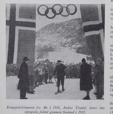Andres Timdal bar fakkelen gjennom Sauland i Hjartdal kommune. Fra Norske skiløpere, 1957.