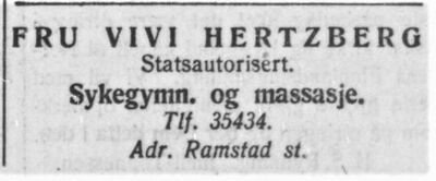 Annonse for fysioterapi hos Vivi Hertzberg, som hun da het.