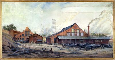- Industritomta sett fra Grünerbrua før Vulkan: Bagaas Brug med Bagaas Badehus, på den høyre bredden ligger Nedre Foss mølle.Foto: Norsk Teknisk Museum (ant. 1866).