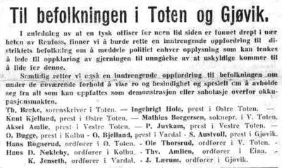 - ↑ Leif Blichfeldt: Gjøvik 1940-45 : krig, okkupasjon, frigjøring. Eget forlag 1992, side 66