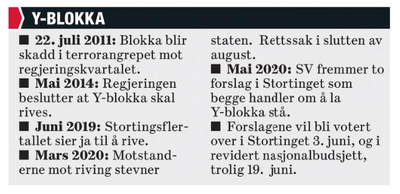 - ↑ Stortinget stopper ikke rivning av Y-blokka – søksmålet mot Staten trekkes, NRK, 3. juni 2020